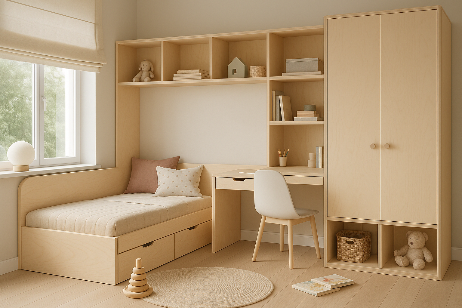 - Безопасная основа. Березовая фанера в сочетании с хорошими финишами подходит для детских интерьеров и не имеет резкого запаха.