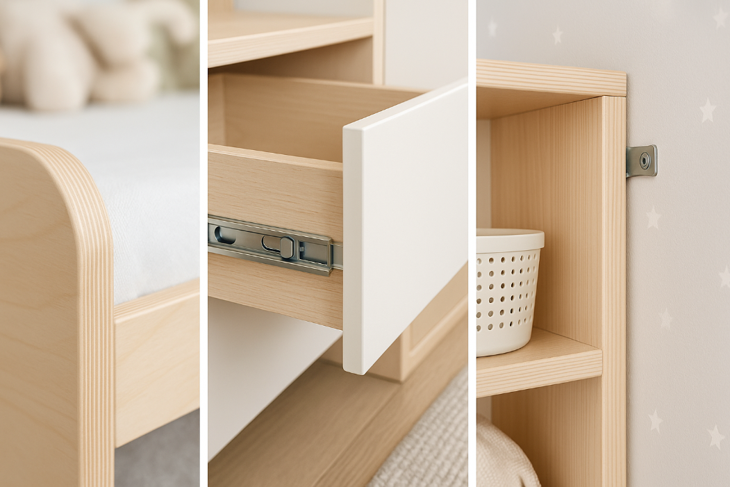 База для большинства наших изделий — натуральная березовая фанера первого сорта. Это не фанера из скрипучих дачных шкафчиков, а аккуратный, стабильный материал для современной детской мебели. Все детали проходят строгий отбор, после чего превращаются в прочные, устойчивые к нагрузкам элементы для кроватей, столов, стеллажей и систем хранения.